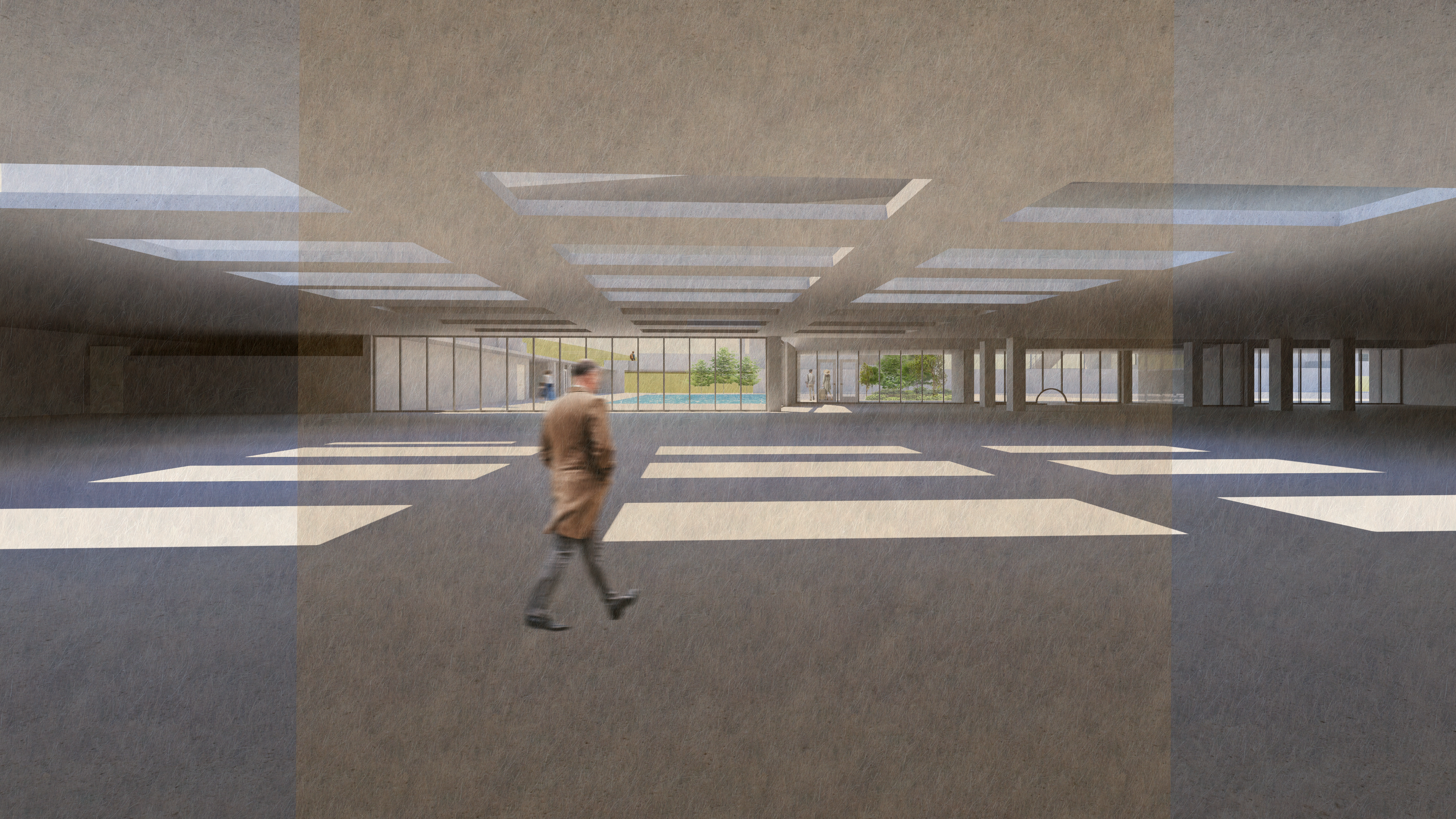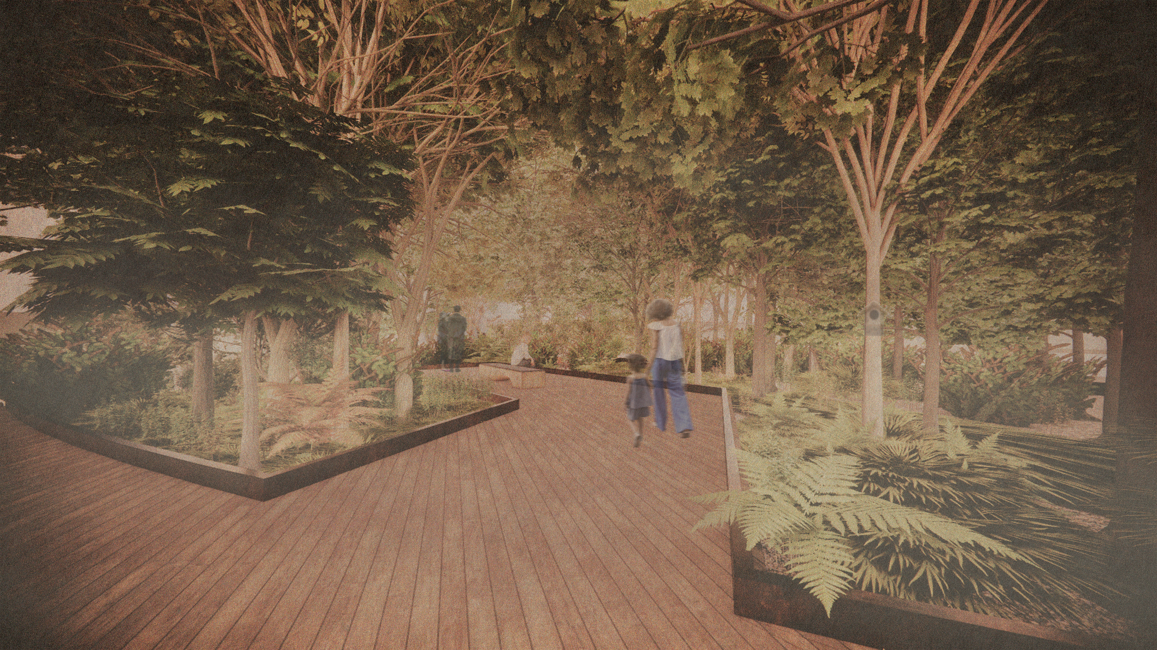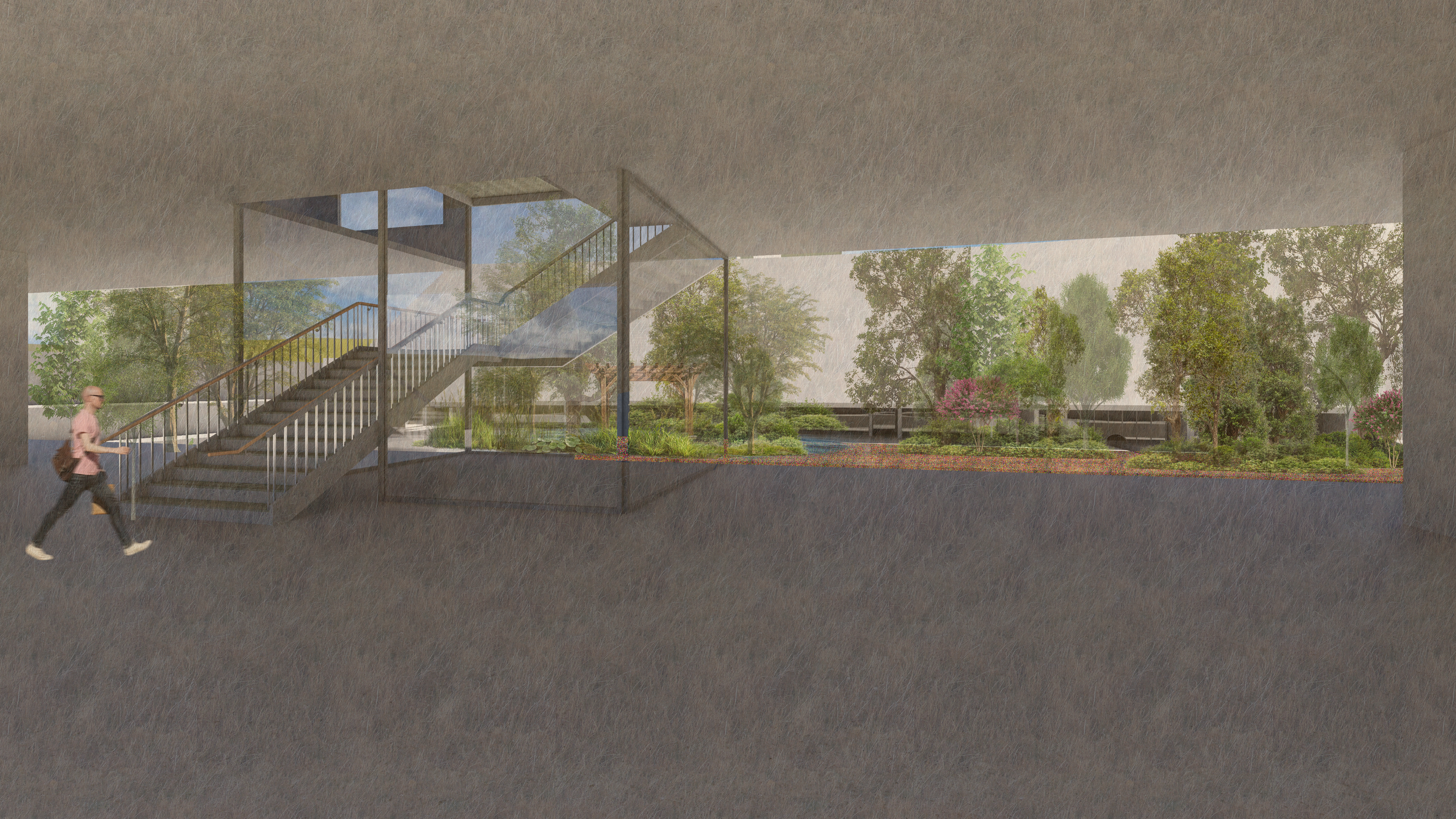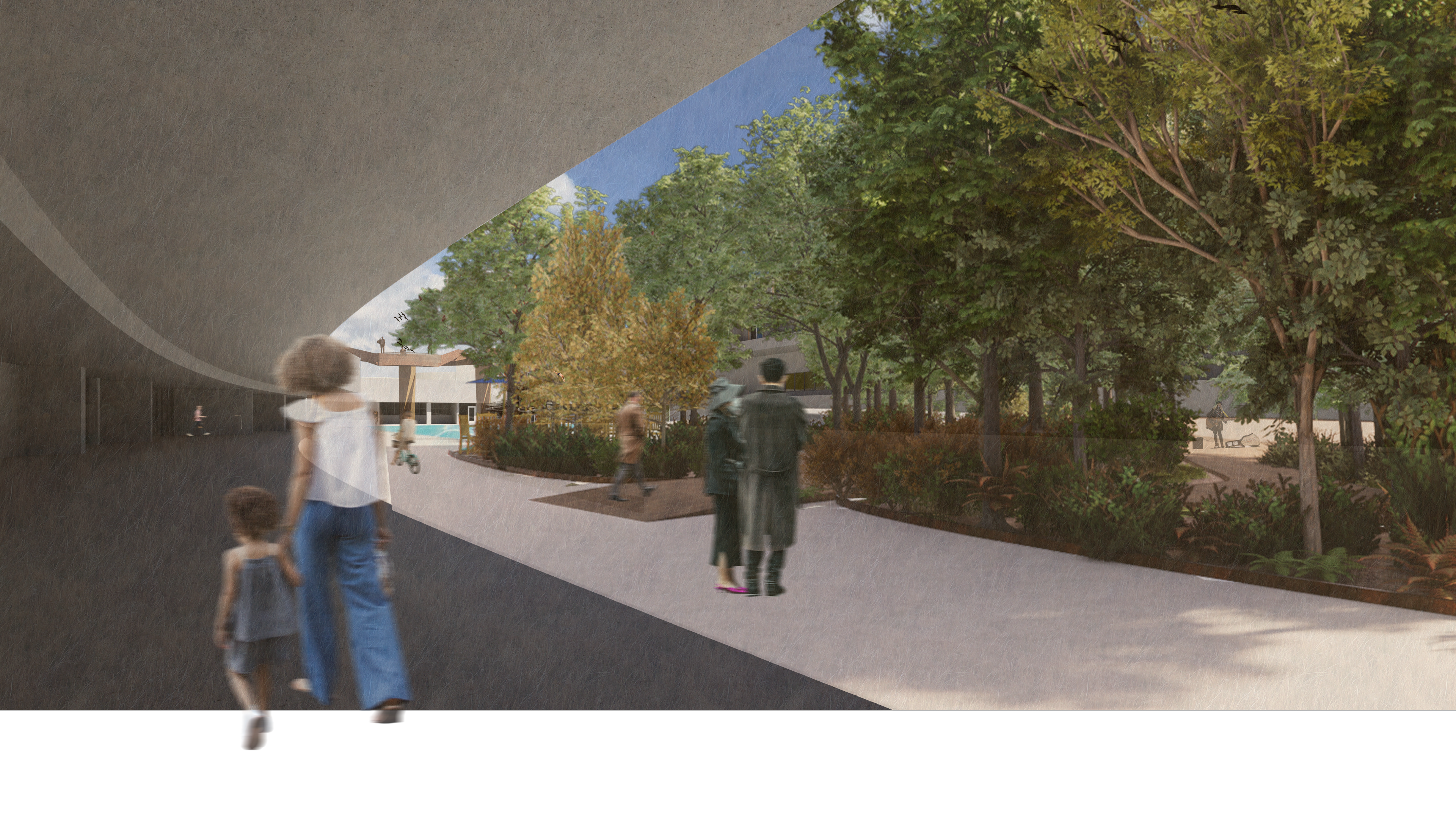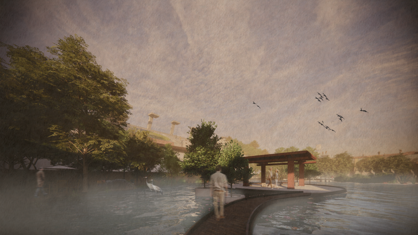Set in current tiblisi, georgia, laguna vere is an abandoned, soviet style diving facility that was destroyed by a major flood in 2015. tasked with bringing the concrete venue back to life, our design team aimed to create a resilient temporary housing project that will serve the city when the waters rise again. remnants of the previous stadium remain above the densely planted miyawaki forests and water management basins, while an elevated loop around the site provides not only views and destinations, but a way of safe egress to the high ground for those in the flood plain.